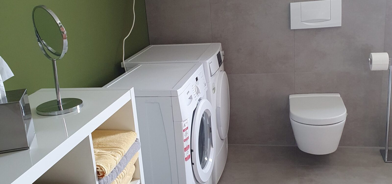 Das Bad verfügt über eine Dusche zwei Waschbecken eine Toilette und eine Waschmaschine Wäschetrockner.